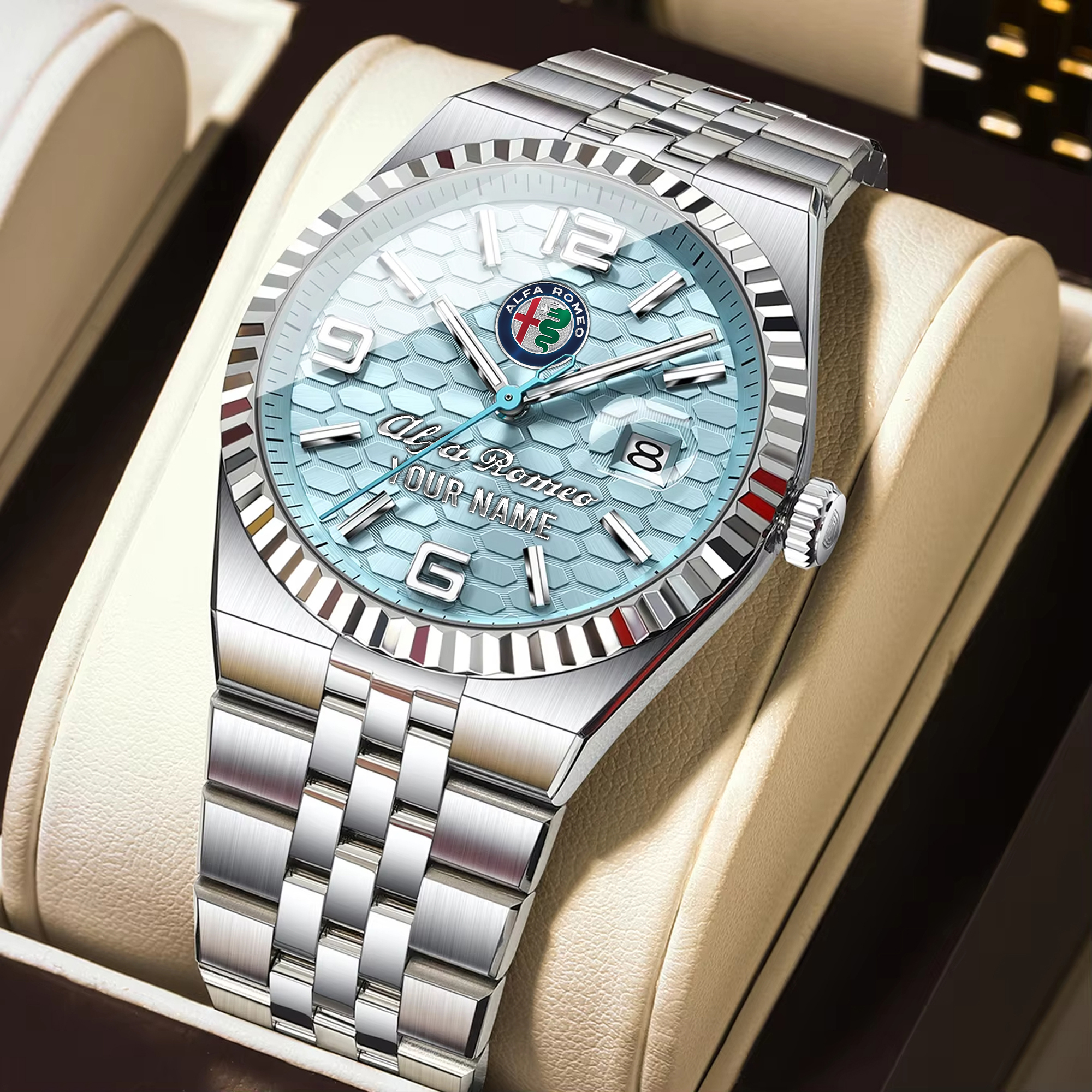 With the launch of the exclusive Made-to-Order service, you can make your watch unique by not only having your special Alfa Romeo Emblem but also your Name printed on the watch. Elevate your style with our custom watches featuring your favorite car logo. Meticulously crafted for durability and water resistance, these watches are the perfect item for daily use. Discover the ultimate combination of luxury, utility, and personalization!