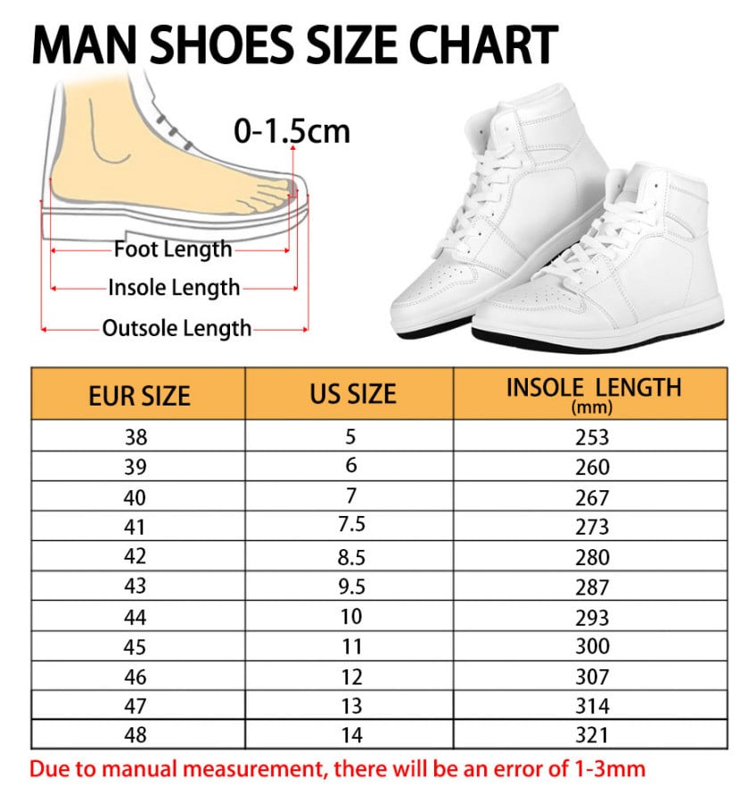 - Each pair of Sneaker Boots is custom printed, cut, and sewn just for you when you place your order – there may be small differences in the design on the seams and /or arms due to the custom nature of the production process!