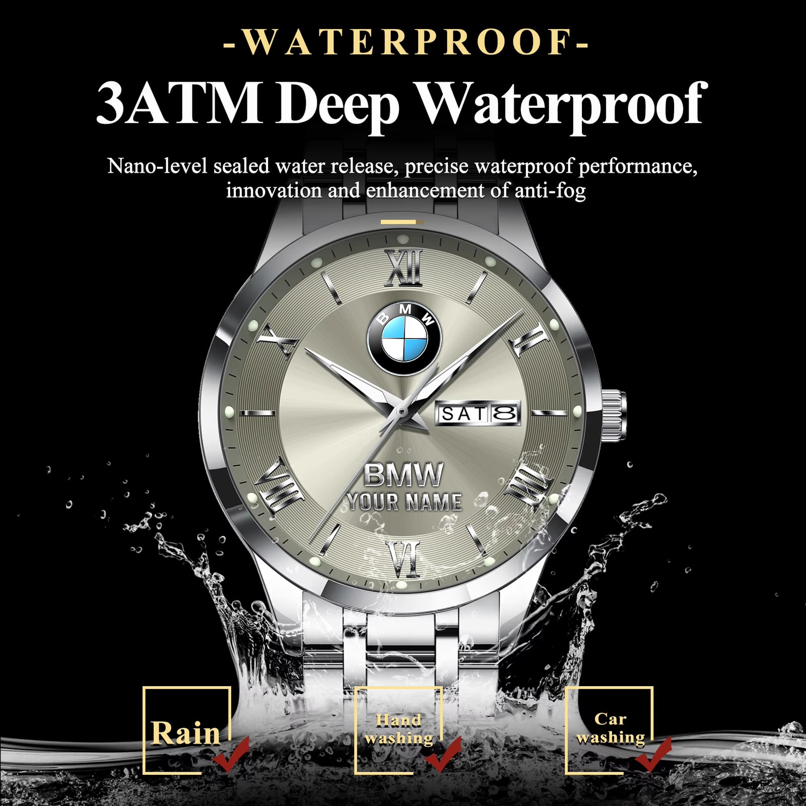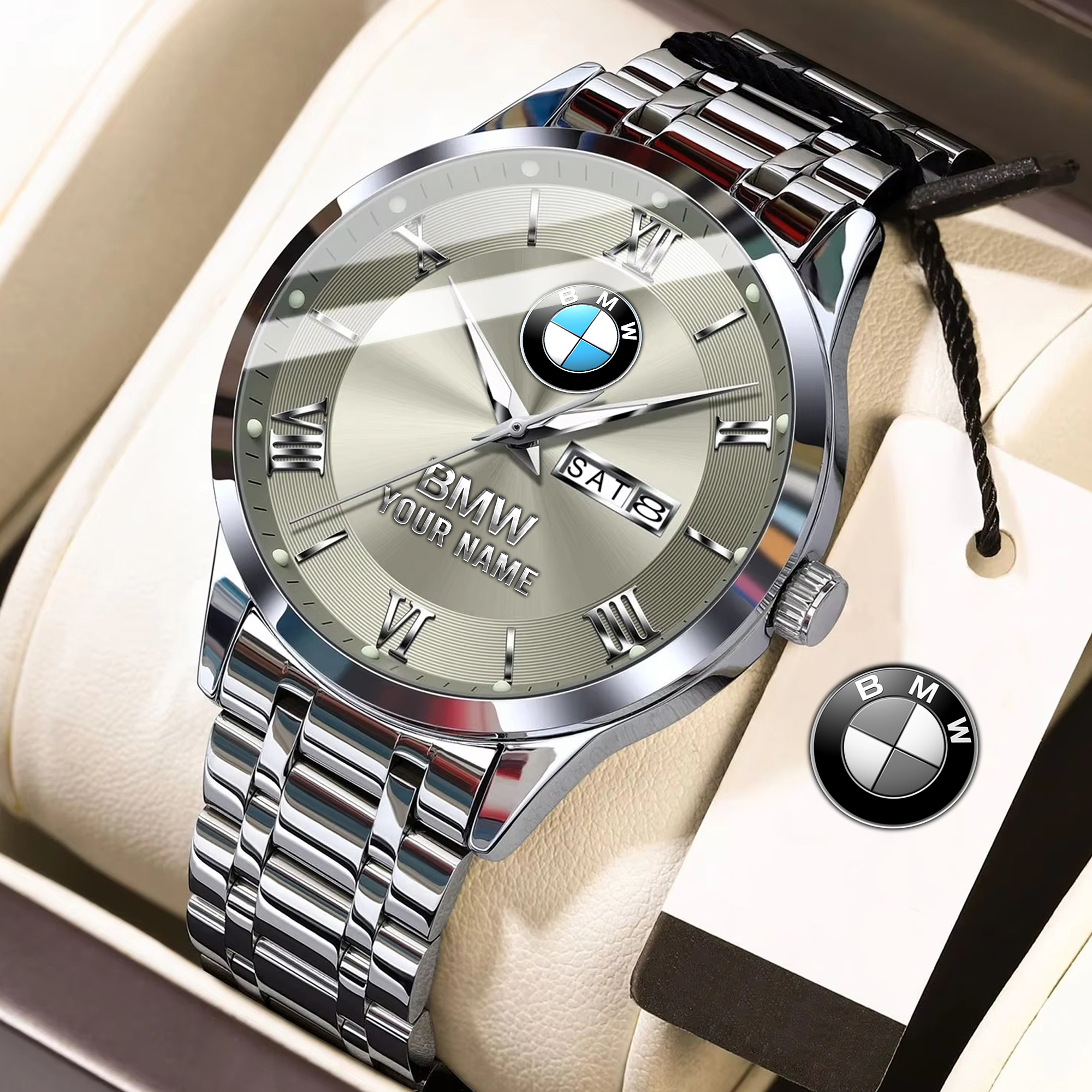 With the launch of the exclusive Made-to-Order service, you can make your watch unique by not only having your special BMW Emblem but also your Name printed on the watch. Elevate your style with our custom watches featuring your favorite car logo. Meticulously crafted for durability and water resistance, these watches are the perfect item for daily use. Discover the ultimate combination of luxury, utility, and personalization!