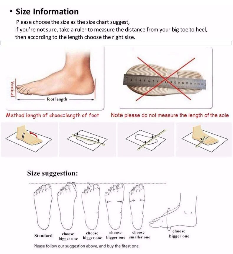 Please check your measurements carefully and choose the correct size when you place order. For any size problems, we will take responsibly only if the size chosen does not match with the above size table. so please do measure your foot length carefully by by referring to the foot length column above