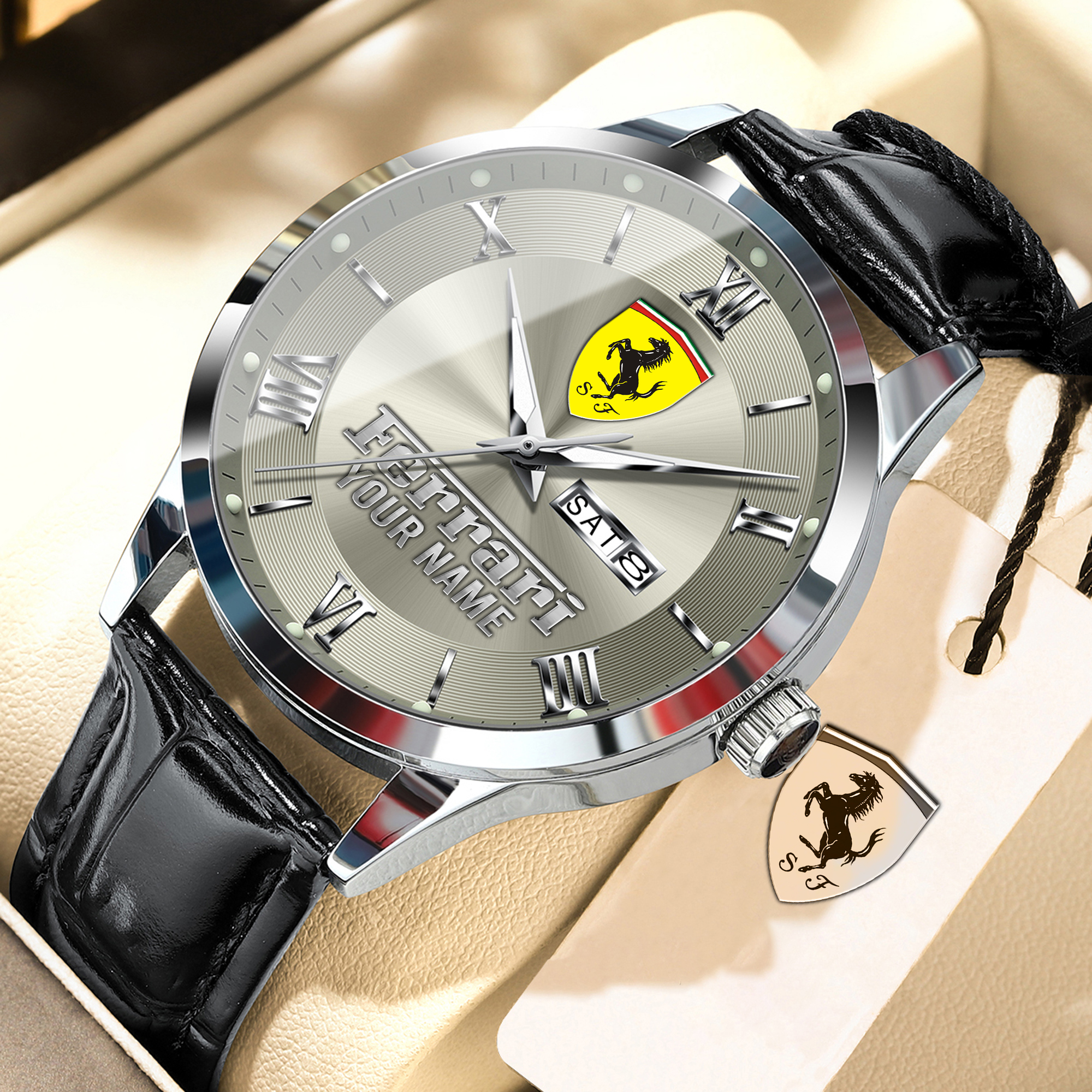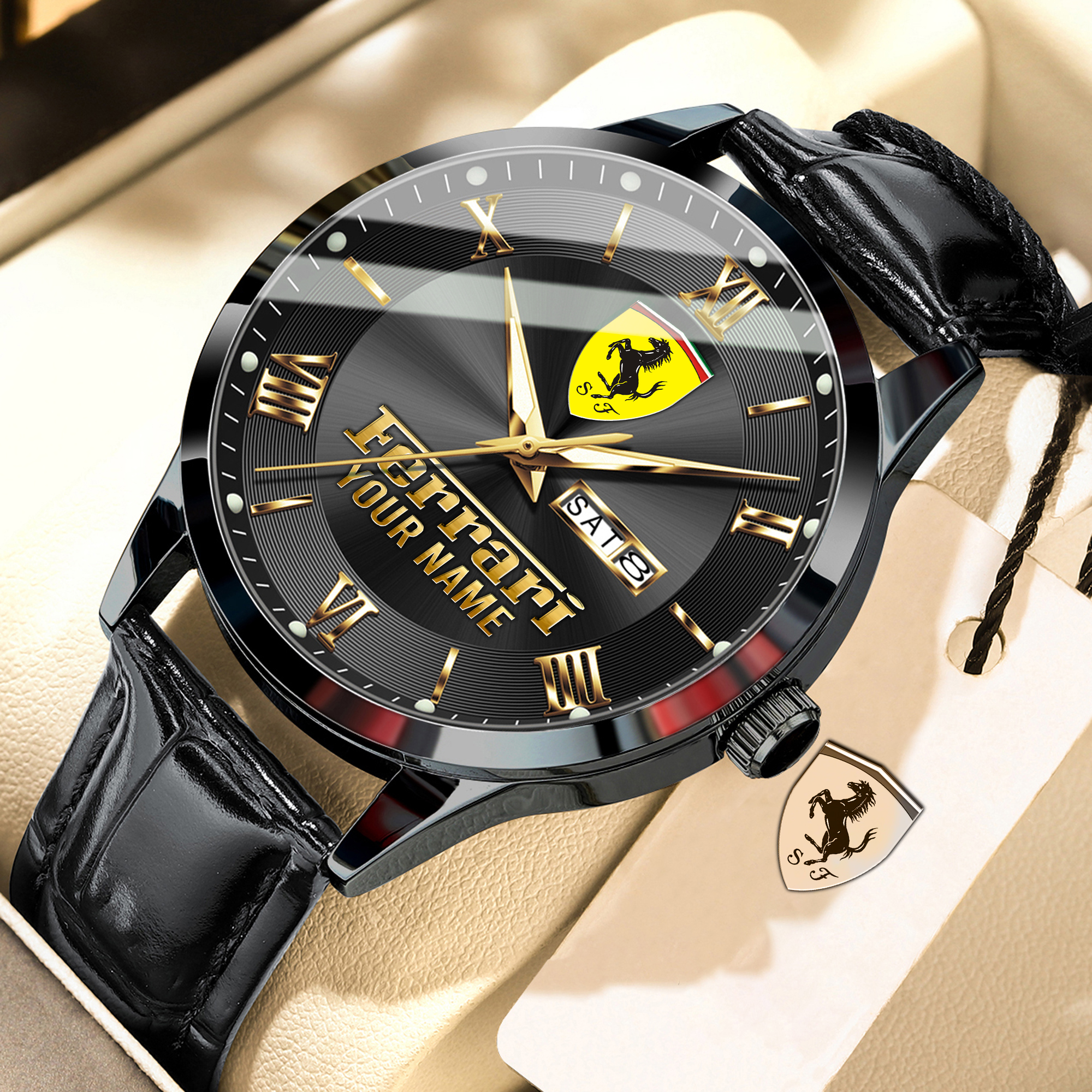 With the launch of the exclusive Made-to-Order service, you can make your watch unique by having your special Ferrari Emblem printed on the watch. Elevate your style with our custom watches featuring your favorite car logo. Meticulously crafted for durability and water resistance, these watches are the perfect item for daily use. Discover the ultimate combination of luxury, utility, and personalization!