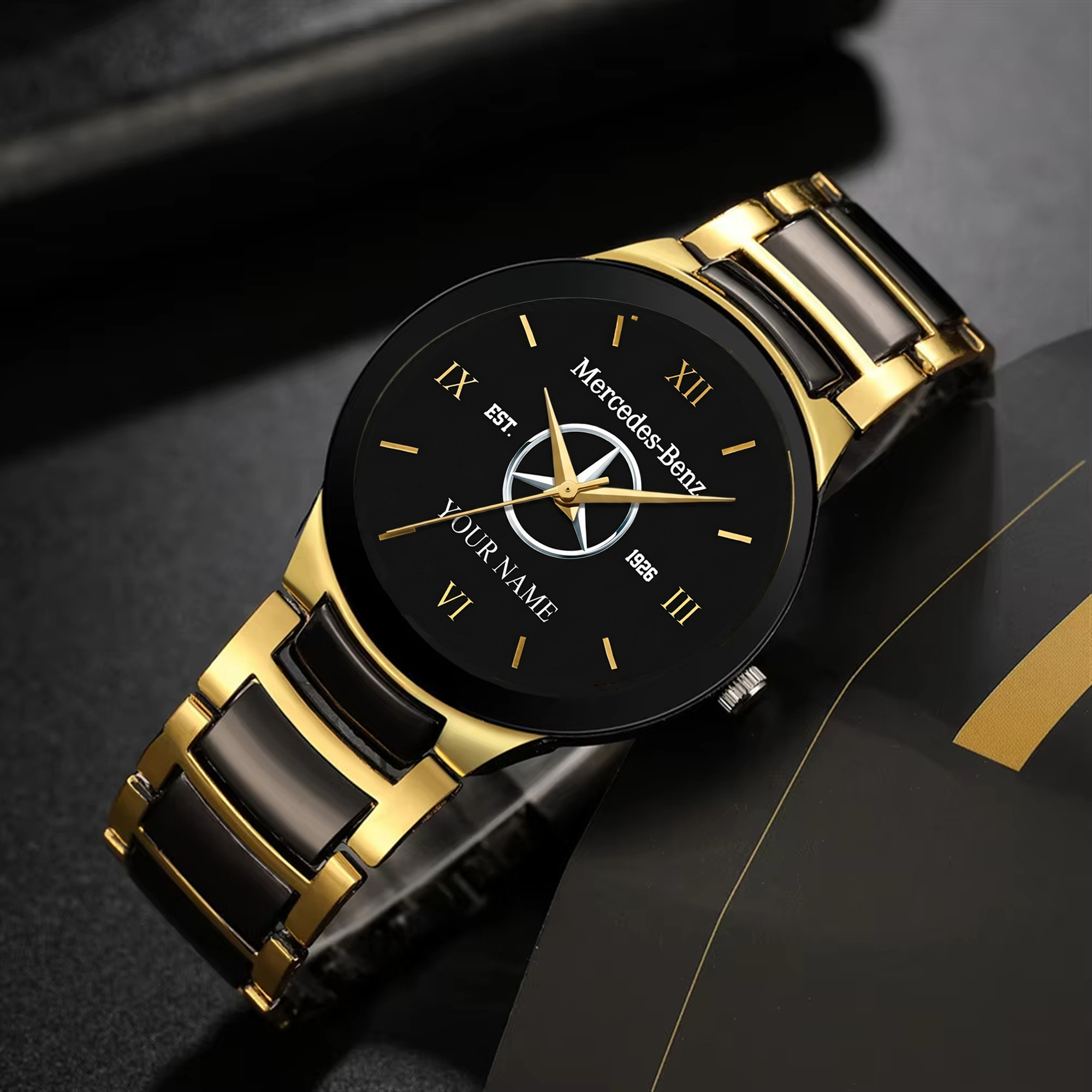 With the launch of the exclusive Made-to-Order service, you can make your watch unique by not only having your special Mercedes Emblem but also your Name printed on the watch. Elevate your style with our custom watches featuring your favorite car logo. Meticulously crafted for durability and water resistance, these watches are the perfect item for daily use. Discover the ultimate combination of luxury, utility, and personalization!