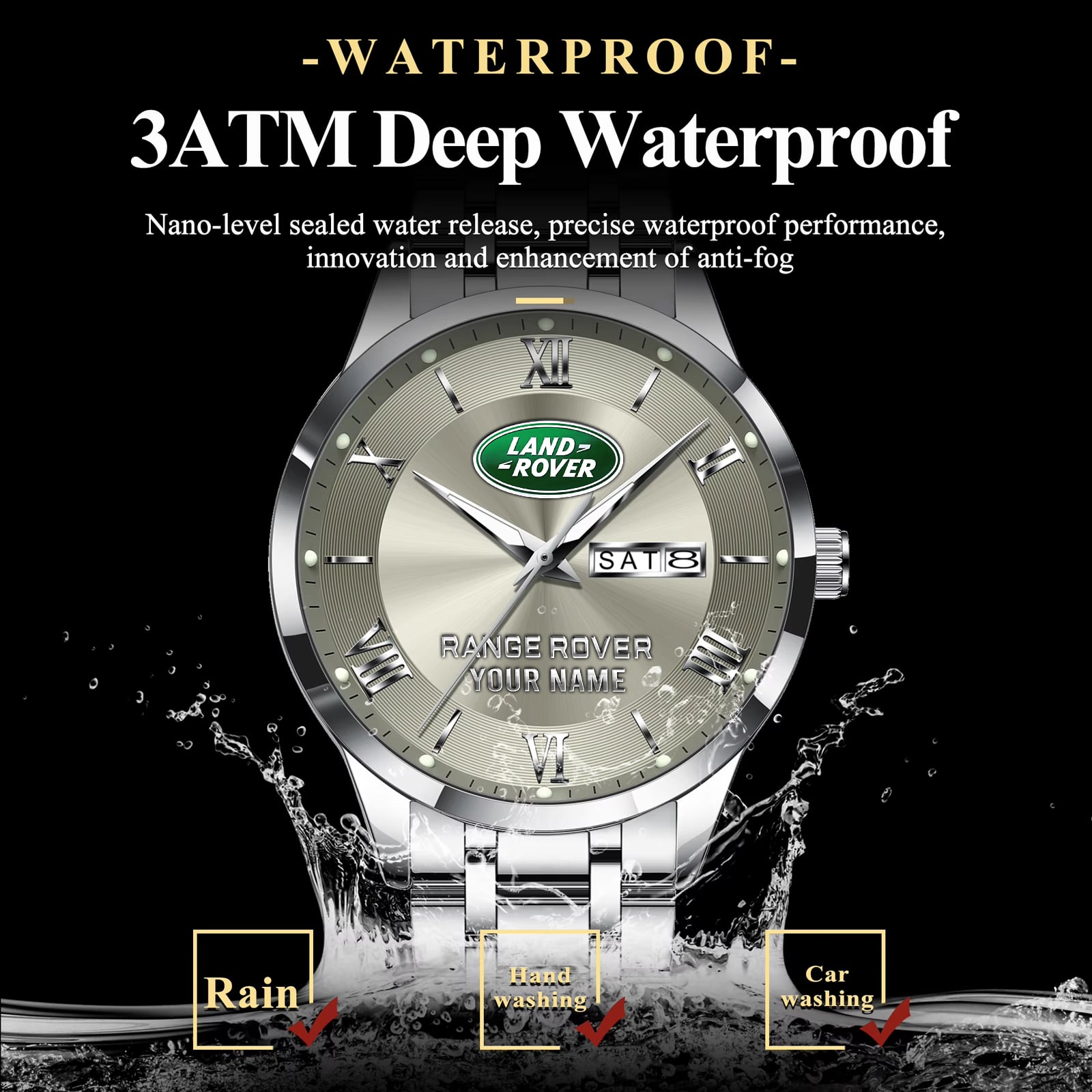 With the launch of the exclusive Made-to-Order service, you can make your watch unique by not only having your special Range Rover Emblem but also your Name printed on the watch. Elevate your style with our custom watches featuring your favorite car logo. Meticulously crafted for durability and water resistance, these watches are the perfect item for daily use. Discover the ultimate combination of luxury, utility, and personalization!